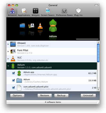 使用mac系統自帶的卸載功能無法完全刪除一些檔,那麼使用Amnesia吧,它不但能夠徹